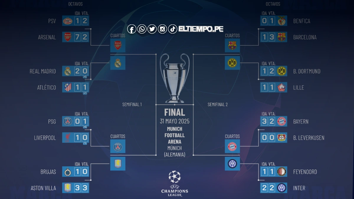 El Inter de Milán también avanzó tras vencer al Feyenoord y se medirá ante el Bayern Múnich, que eliminó al Bayer Leverkusen. Finalmente, el Barcelona superó al Benfica y se enfrentará al Borussia Dortmund, que dejó en el camino al Lille.