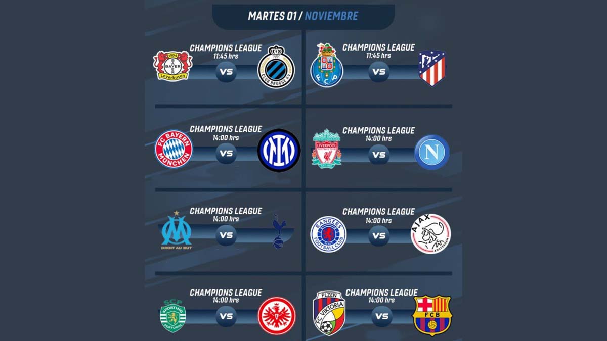 - Sintoniza Atlético Madrid vs Porto, Bayern vs Inter, Barcelona vs Plzen, Marsella vs Tottenham, Leverkusen vs Brujas, Liverpool vs Napoli, Rangers vs Ajax y Sporting Lisboa vs Frankfurt EN VIVO, online y en directo