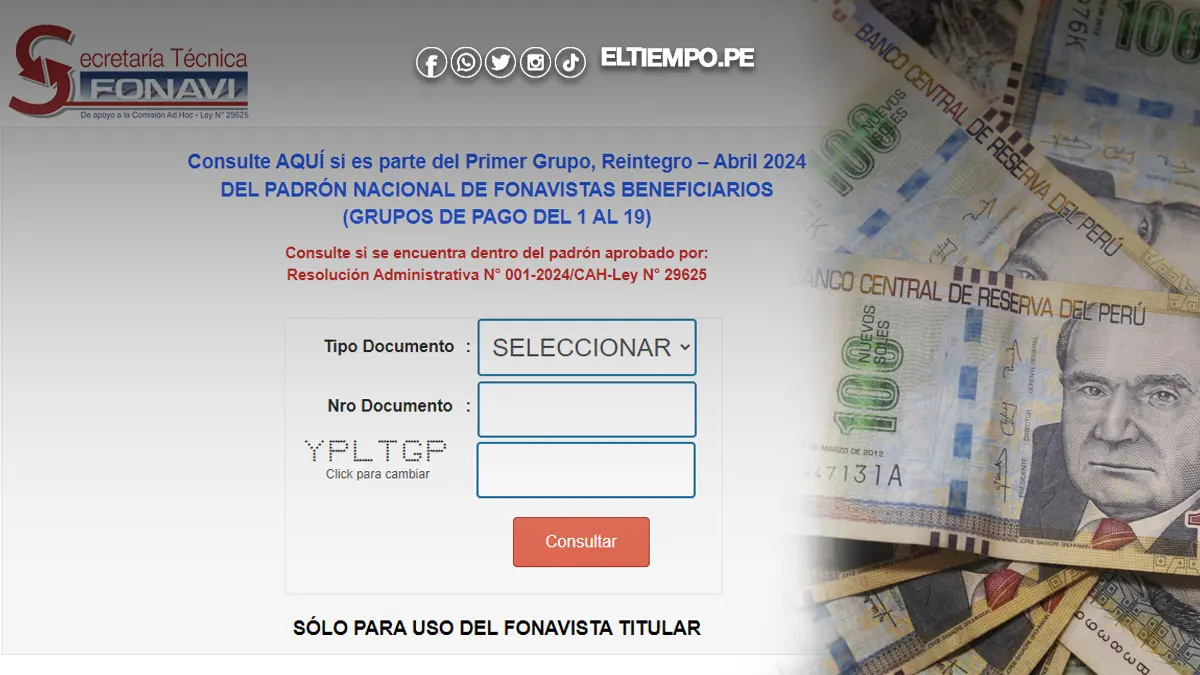 Los fonavistas podrán verificar si forman parte del Primer Grupo de Reintegro a partir del jueves 25 de abril mediante la página web https://fonavi-st.gob.pe/sifonavi/ y www.fonavi-st.pe. Allí, deberán hacer clic en el botón «Consulte aquí si es parte del Primer Grupo, Reintegro – Abril 2024». También podrán obtener información llamando a Aló Mac, opción 1800, o a la central telefónica 01 640-8655 de la Secretaría Técnica de Apoyo a la Comisión Ad Hoc del Fonavi.