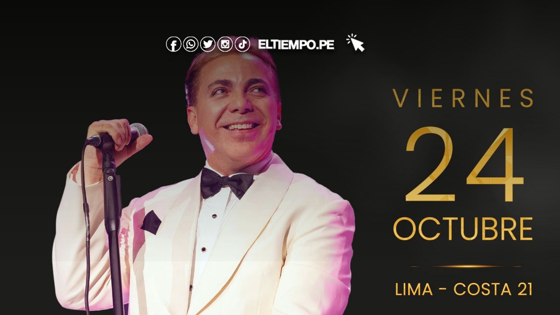 El artista, conocido como el “Gallito Feliz”, no se presenta en Perú desde el 2022. En esta oportunidad, volverá con un show renovado que incluirá un repaso por sus canciones más emblemáticas. Entre ellas destacan “Yo quería”, “Volver a amar”, “Si tú me amaras”, “Lloran las rosas” y “Lloviendo estrellas”, temas que se han convertido en clásicos de la música latina.