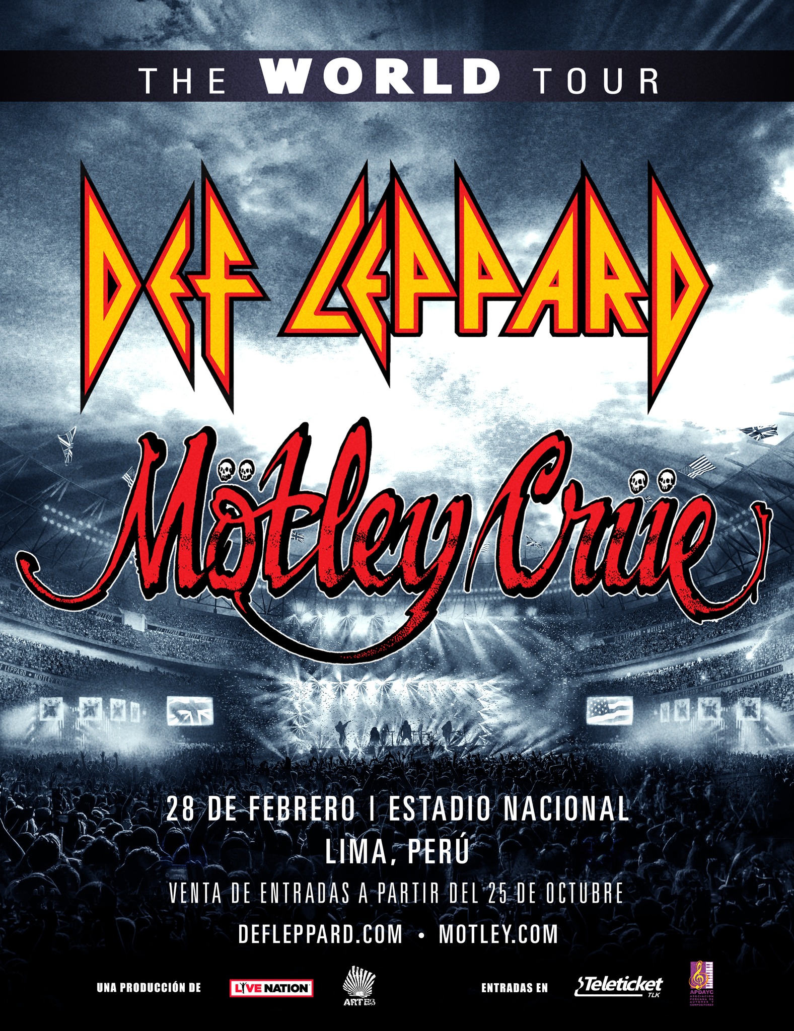 Grandes artistas siguen sumando a Perú para sus respectivos conciertos y esta vez son las bandas de rock Mötley Crüe y Def Leppard que confirmaron su visita a nuestro país para brindar un espectacular show rockero. Ambas agrupaciones pisarán, por primera vez, tierras peruanas con The World Tour, continuando el éxito de su gira de estadios por Estados Unidos.