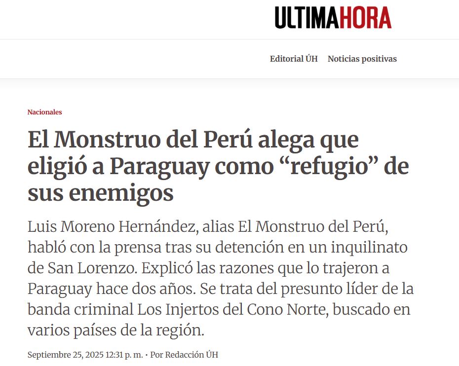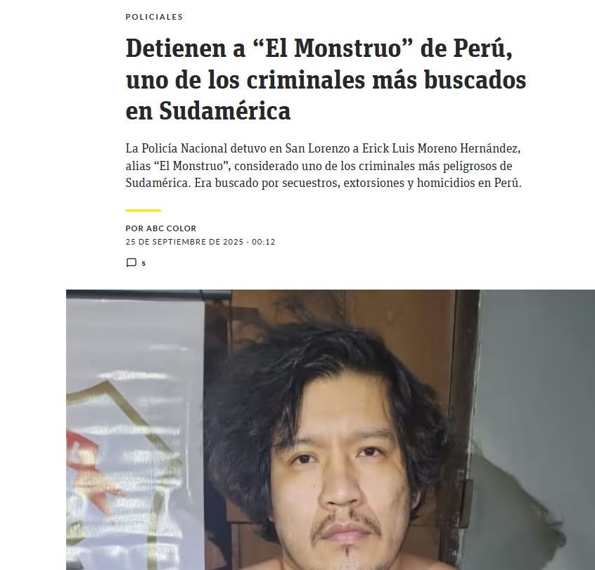 La noche del 24 de septiembre se confirmó la detención de Erick Moreno Hernández, alias “El Monstruo”, en la ciudad paraguaya de San Lorenzo. Moreno, considerado uno de los delincuentes más buscados por las autoridades peruanas, es señalado como cabecilla de la organización criminal ‘Los Injertos del Cono Norte’ y afronta acusaciones por diversos delitos, entre ellos homicidio y secuestro.