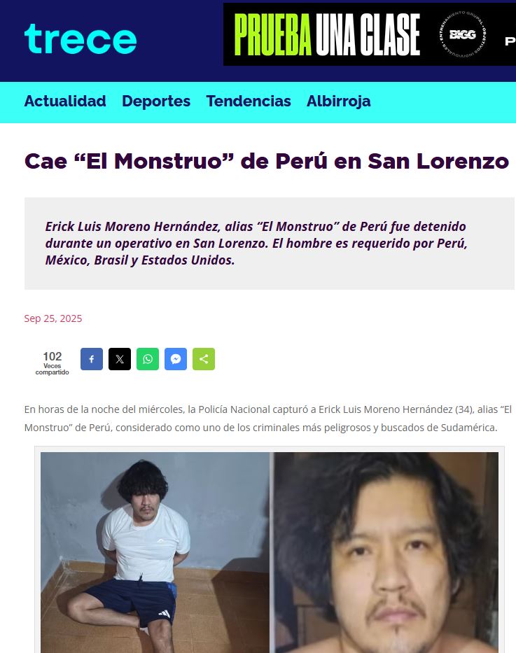 La noche del 24 de septiembre se confirmó la detención de Erick Moreno Hernández, alias “El Monstruo”, en la ciudad paraguaya de San Lorenzo. Moreno, considerado uno de los delincuentes más buscados por las autoridades peruanas, es señalado como cabecilla de la organización criminal ‘Los Injertos del Cono Norte’ y afronta acusaciones por diversos delitos, entre ellos homicidio y secuestro.