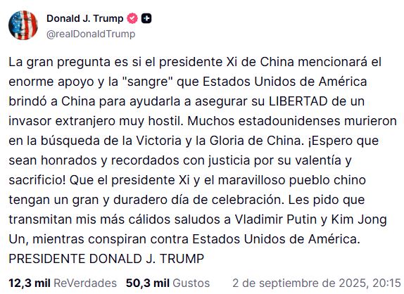 El presidente de Estados Unidos, Donald Trump, volvió a generar titulares internacionales tras publicar un mensaje en su red social Truth Social, en el que se refirió a la conmemoración militar realizada en Pekín por el 80 aniversario del fin de la Segunda Guerra Mundial.