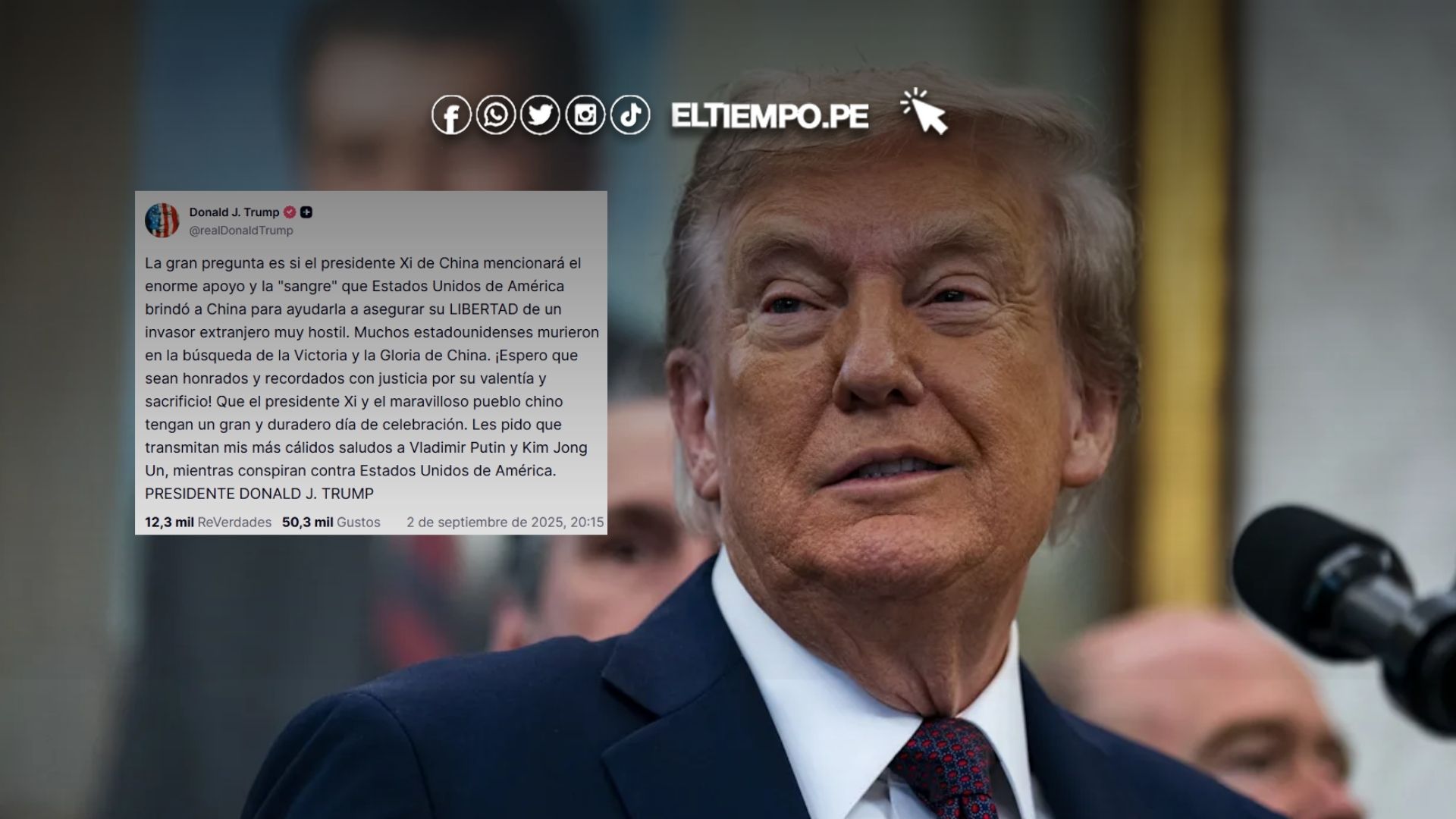 El presidente de Estados Unidos, Donald Trump, volvió a generar titulares internacionales tras publicar un mensaje en su red social Truth Social, en el que se refirió a la conmemoración militar realizada en Pekín por el 80 aniversario del fin de la Segunda Guerra Mundial.