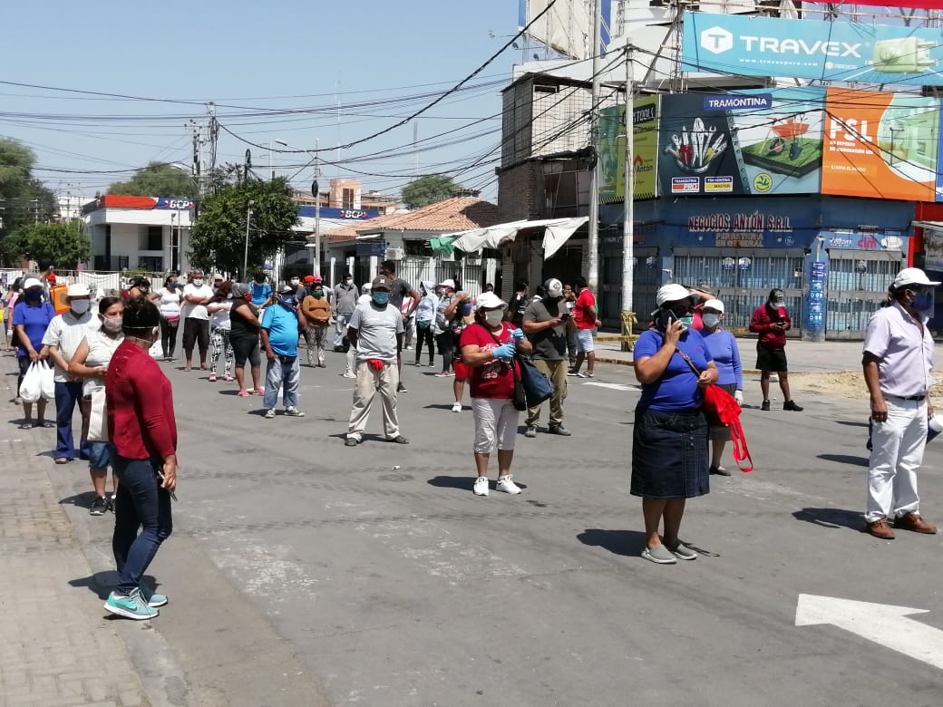 El Ejército Peruano ordenó a los comerciantes respetando el distanciamiento físico, luego uno por uno pasó para llevar a cabo el test de prueba rápida en las carpas instaladas por la Dirección Regional de Salud (Diresa).