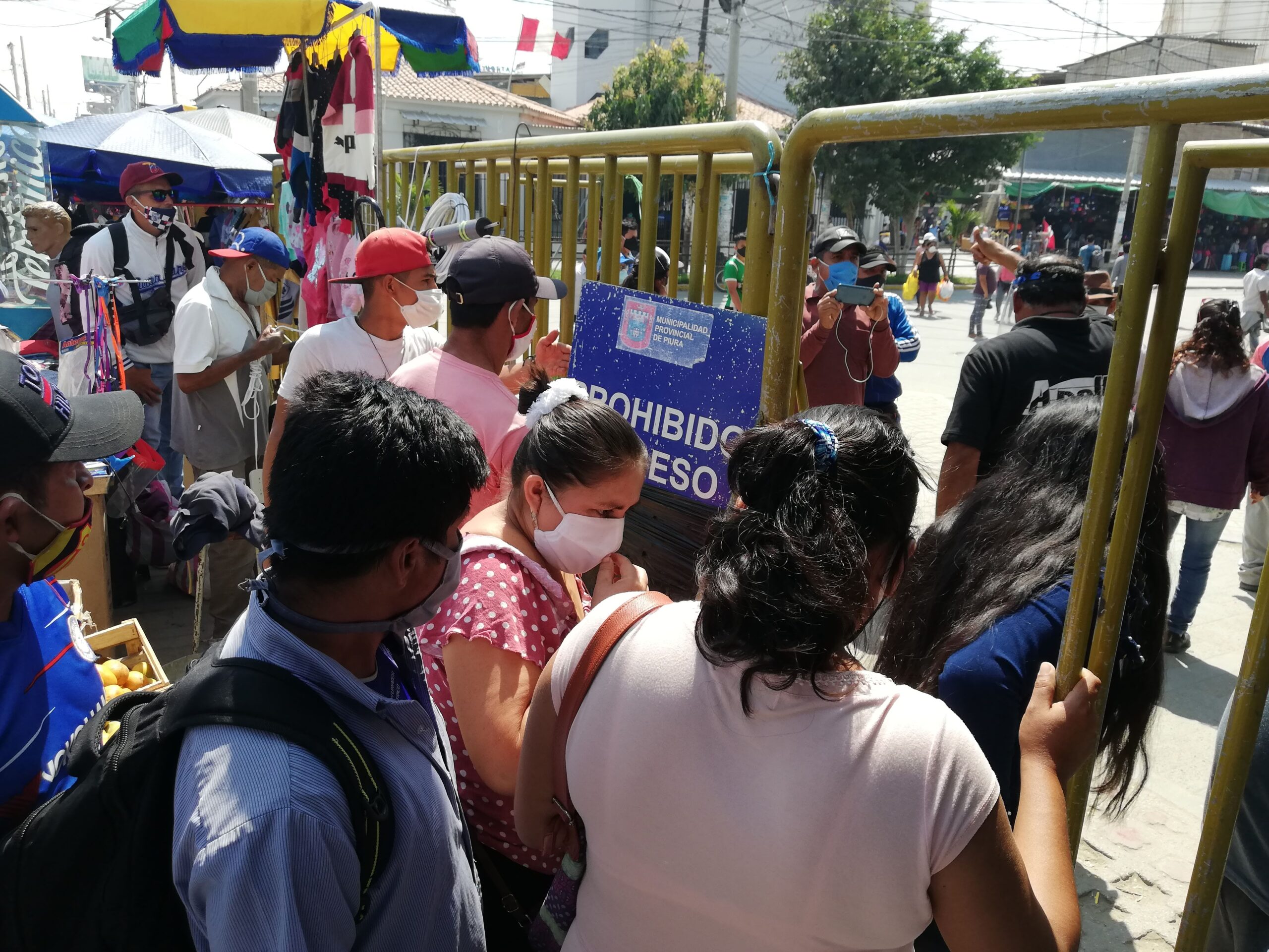 Lo visto en el terminal pesquero se repite en la puerta de acceso al mercado de Piura (de Sánchez Cerro y Mártires de Uchuraccay) en donde la gente lidia con los ambulantes y se aglomera para ingresar por una pequeña puerta.