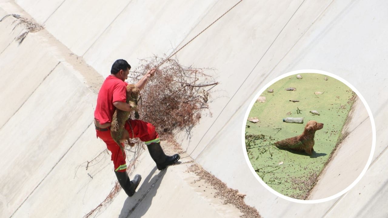 La Compañía de Bomberos N°40 de Catacaos rescata a perro que había caído en el dren Sullana.