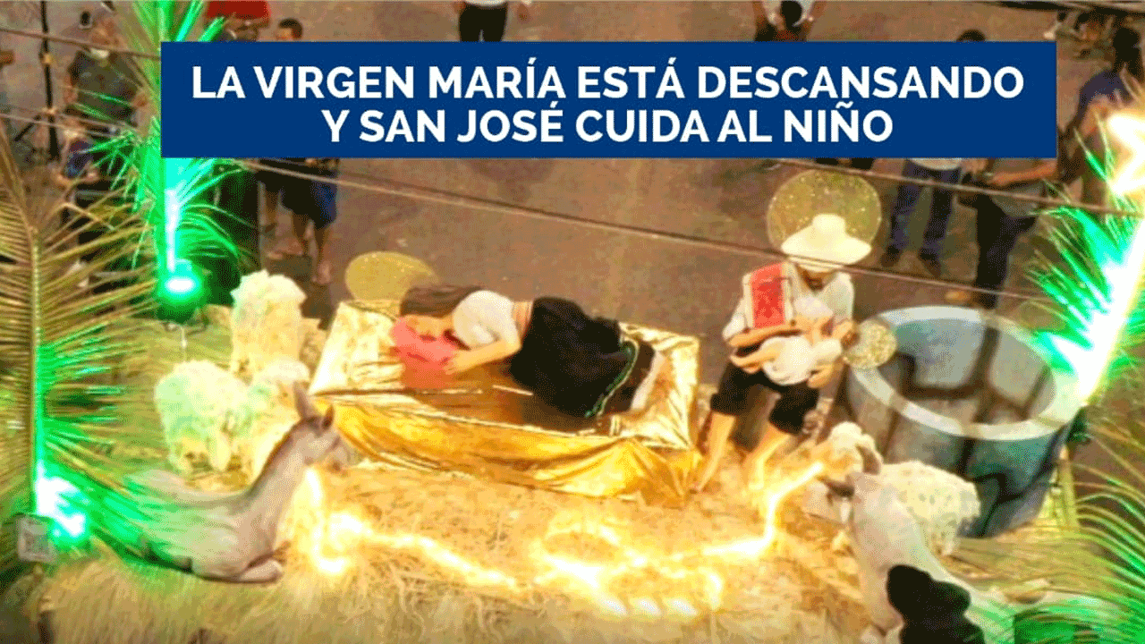 El pesebre muestra a la imagen de la Virgen María descansando luego del parto, mientras que San José ayuda a cuidar al Niño Jesús.