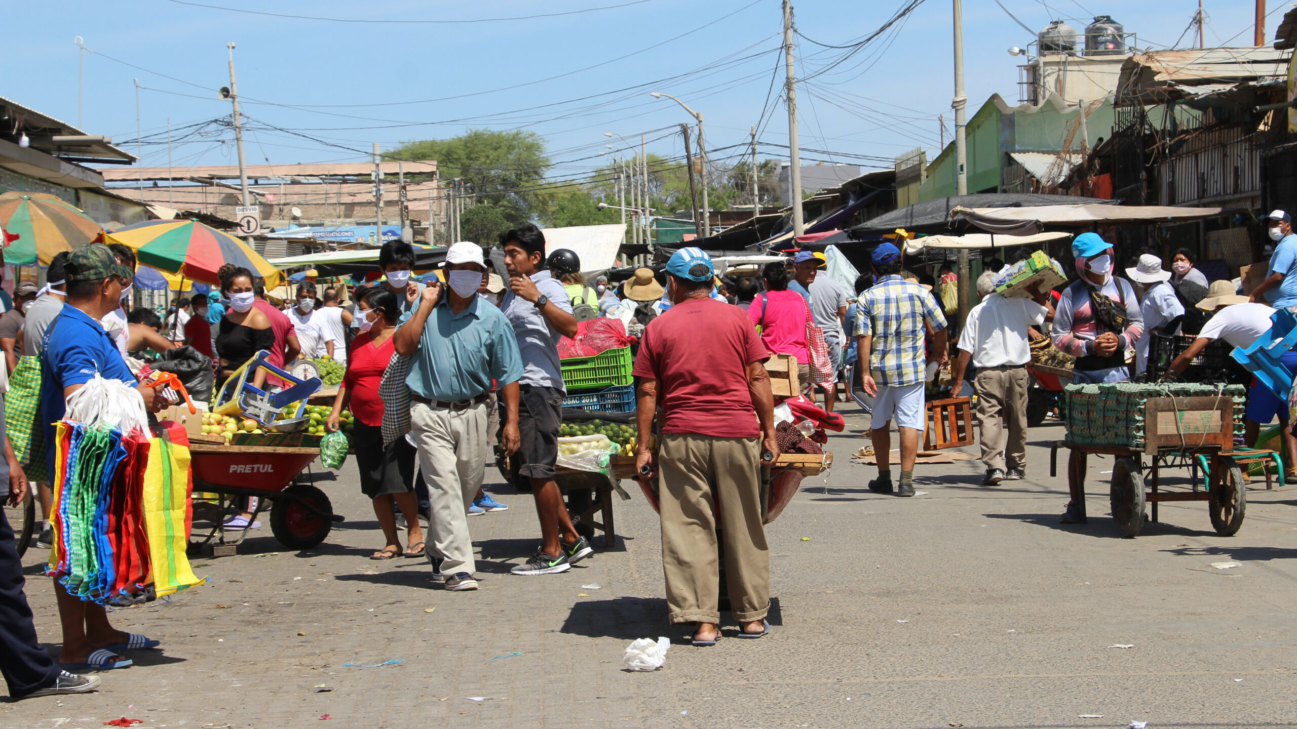 La informalidad también se hizo presente para agravar la crisis en el centro de abasto. Decenas de ambulantes continúan tomando veredas de avenidas como Blas de Atienza Precisamente, la MPP hizo ayer una labor de desinfección de las calles del Complejo de Mercados y por solo unos minutos, los ambulantes retiraron su mercadería de las calles, pero luego las volvieron a ocupar y vender.
