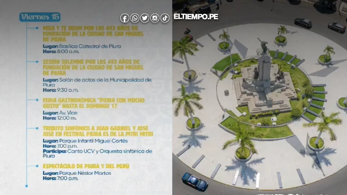 Las actividades centrales se desarrollarán el viernes 15, iniciando con la Misa y Te Deum en la Basílica Catedral (8:00 a. m.), seguido de la sesión solemne en el Salón Miguel Grau (9:30 a. m.). Al mediodía, se inaugurará la feria gastronómica “Piura con Mucho Gusto” en la avenida Vice, disponible hasta el domingo 17.