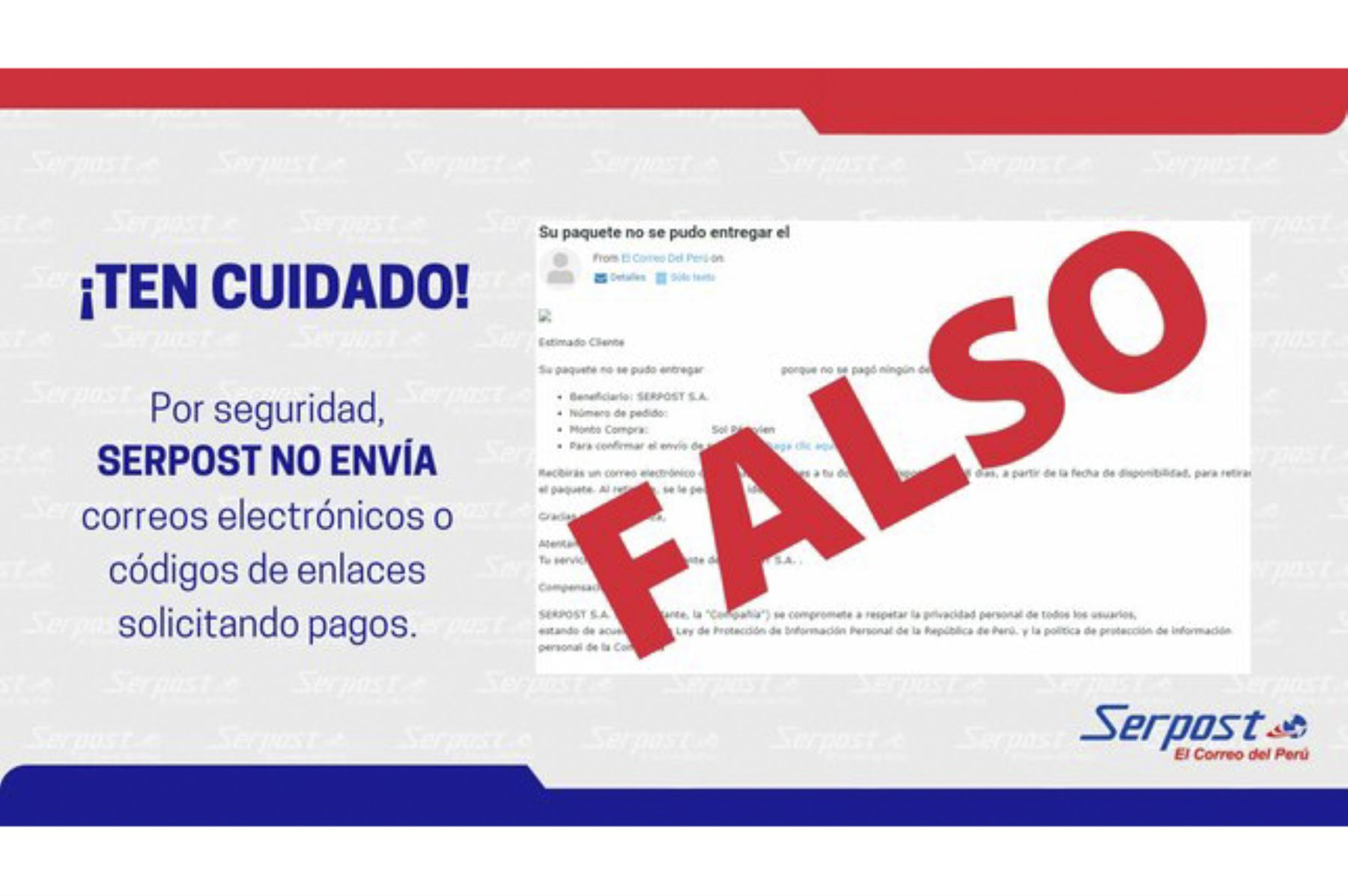 La empresa Servicios Postales del Perú (SERPOST) alertó a la ciudadanía sobre diversos intentos de fraude realizados vía correo electrónico, mensaje de texto o WhatsApp en los que se solicitan pagos por los servicios que la institución brinda regularmente.