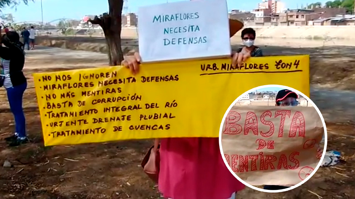 La presidenta de la Juveco de la urbanización Miraflores, Flor Infante, convocó desde las 9 a.m. a los vecinos de la zona para llevar a cabo un plantón, entre los puentes Cáceres y Sánchez Cerro, para expresar su descontento por el retraso e ineficiencia en las obras de las defensas ribereñas.