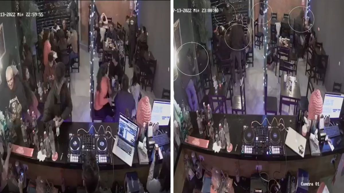 Cinco sujetos portando cascos de motocicletas, capuchas y mascarillas ingresaron al establecimiento con armas de fuego para cometer el delito. En menos de tres minutos, los asaltantes quitaron las pertenencias de los clientes.