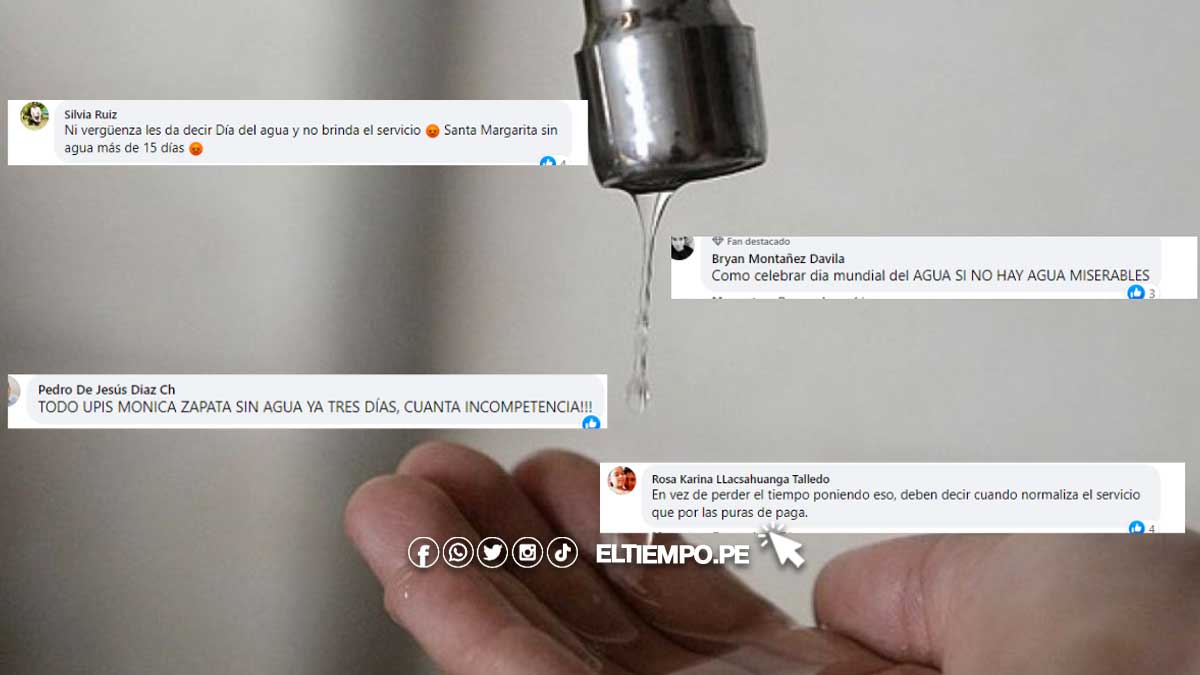 «Es el día del agua y precisamente hoy el asentamiento humano los algarrobos como siempre no tiene servicio de agua potable y nadie avisó de corte», «Señores de la EPS Grau, en la urbanización 21 de agosto no contamos con este servicio desde el día 23 de diciembre del año pasado, vamos a cumplir 3 meses sin agua», «Cómo celebrar día mundial del agua si no hay agua«, son algunas de las denuncias de lo usuarios.