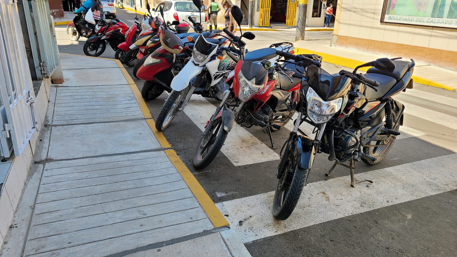 Asimismo, en la otra esquina de la misma calle, se observa una fila de motocicletas que, al igual del caso anterior de la camioneta, infringe la norma al estacionarse en zona rígida. Además, demuestran una severa falta de empatía al obstruir la rampa de acceso para personas con discapacidad.