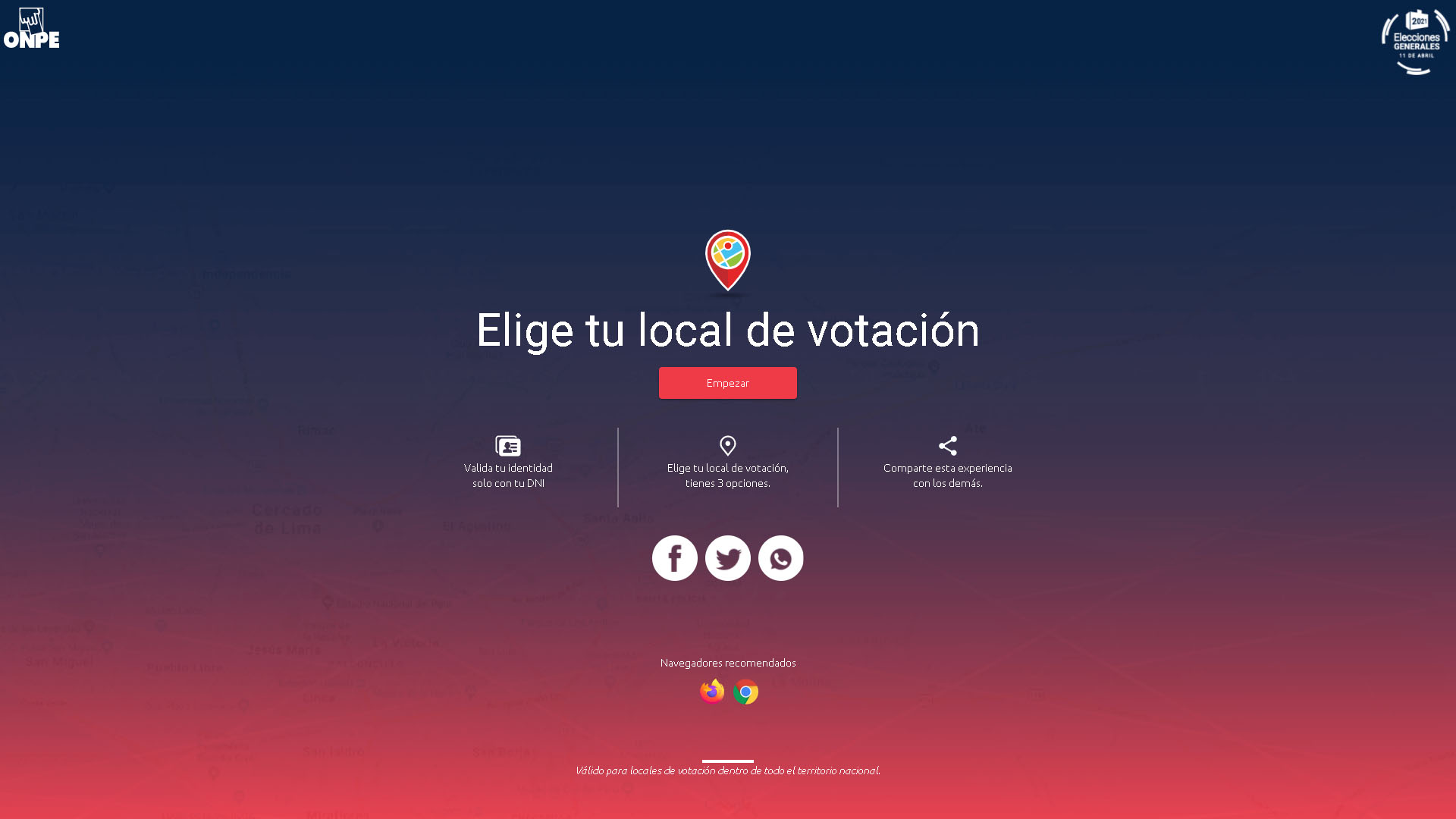 La Oficina Nacional de Proceso Electorales (ONPE) amplió hasta el domingo 3 de enero de 2021 la vigencia de la plataforma Elige tu local de votación, a fin de que los ciudadanos pueden seleccionar hasta tres locales donde votarán en las elecciones del 11 de abril de 2021.