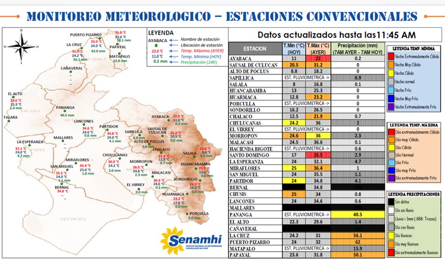 De acuerdo al Servicio Nacional de Meteorología e Hidrología (Senamhi), Zonal 1, el mayor registro se produjo en la estación de Pananga en la provincia de Sullana con 40,5 mm y en Puerto Pizarro se repitió otro evento natural con una medición de 62 mm.