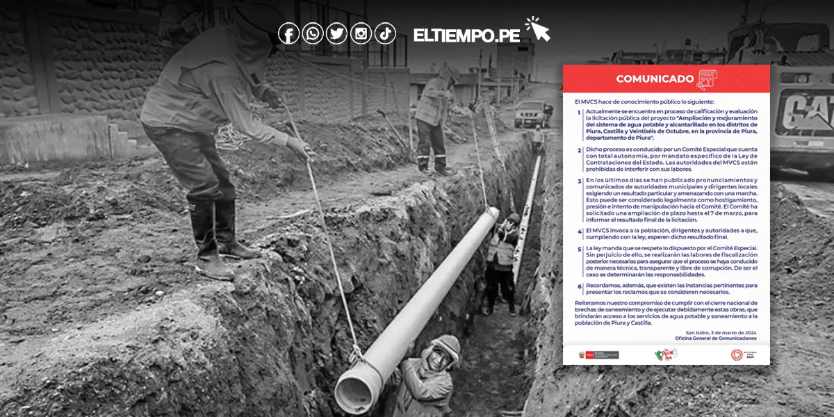 El Ministerio de Vivienda, Construcción y Saneamiento (MVCS) informó sobre el proceso en curso de calificación y evaluación de la licitación pública para el proyecto de «Ampliación y Mejoramiento del Sistema de Agua Potable y Alcantarillado» en Piura, Castilla y Veintiséis de Octubre, Piura.