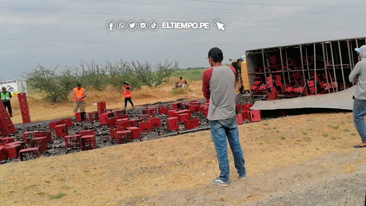 Esta tarde un camión que trasladaba cajas de cerveza sufrió una volcadura en la carretera Piura – Sullana, a la altura del peaje.
