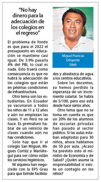 De las 6.895 instituciones educativas de Piura, solo cuatro (0,1%) cumplen con los tres requisitos para el retorno seguro. Los requisitos consisten en la información epidemiológica de la comunidad y condiciones de bioseguridad como el uso de mascarillas, acceso a agua, desinfectante y aulas con aforo permitido.