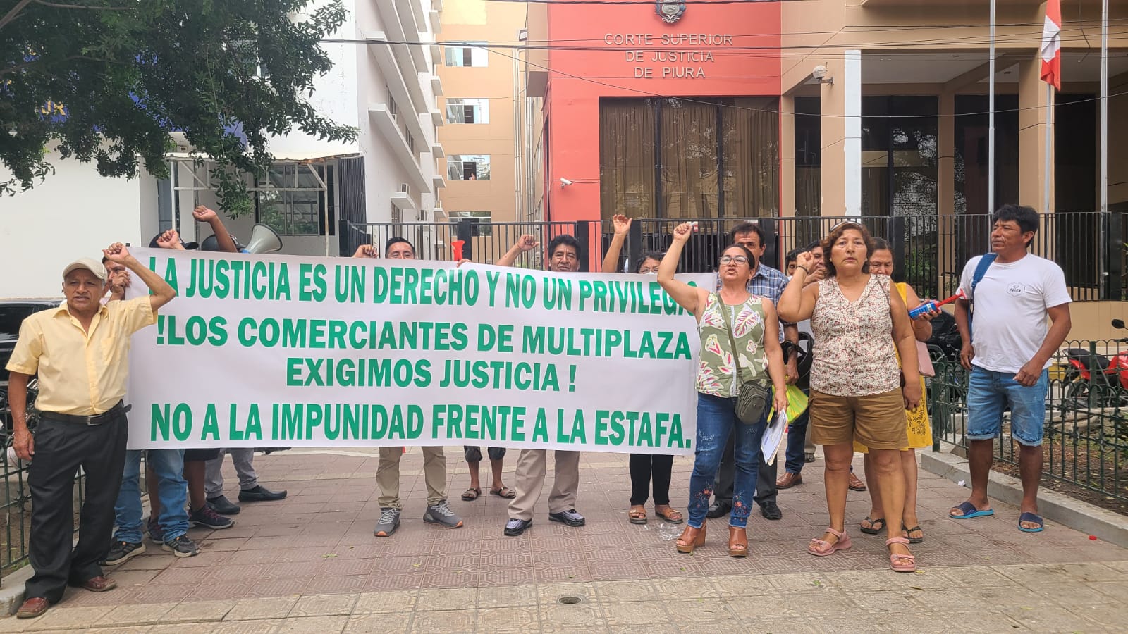 Aproximadamente 30 integrantes de la Asociación de Comerciates Multiplaza Piura-Norte realizaron un plantón frente a las instalaciones de la Corte Superior de Justicia de Piura para exigir celeridad en el proceso judicial por el presunto delito de estafa en la compra de un terreno ubicado en la avenida Sánchez Cerro, para la construcción de un nuevo mercado.