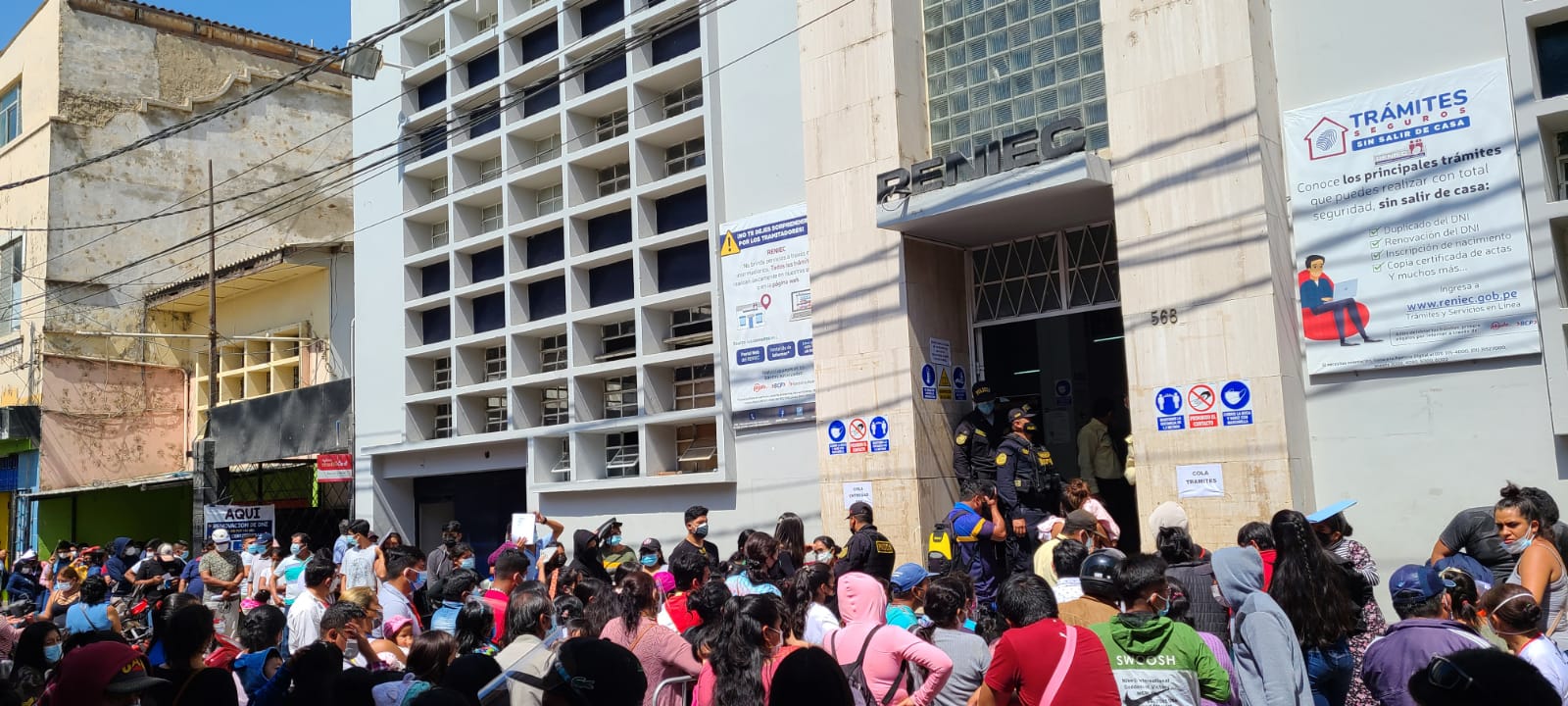 Largas colas y aglomeraciones se reportaron en los exteriores de las oficinas del Registro Nacional de Identificación y Estado Civil ubicado en el centro de Piura.
