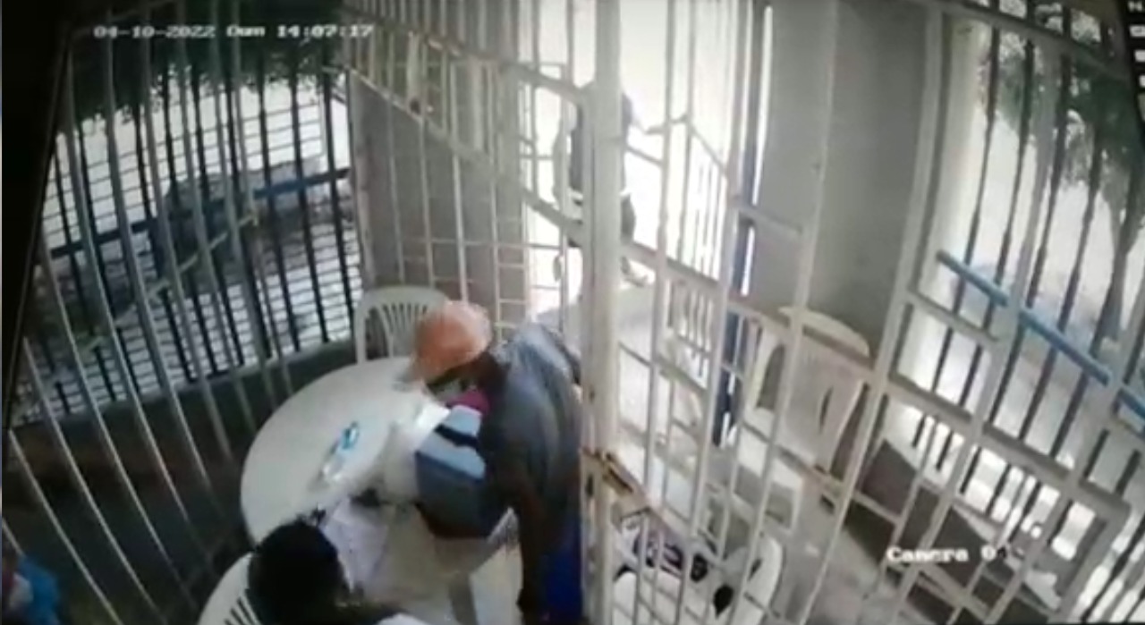 En las imágenes se muestra como tres sujetos se encontraban afuera del punto fijo, cuando uno de ellos, que vestía un short azul, ingresa al lugar para arrebatarles un celular con cerca de S/. 500 y una cartera con objetos de valor.