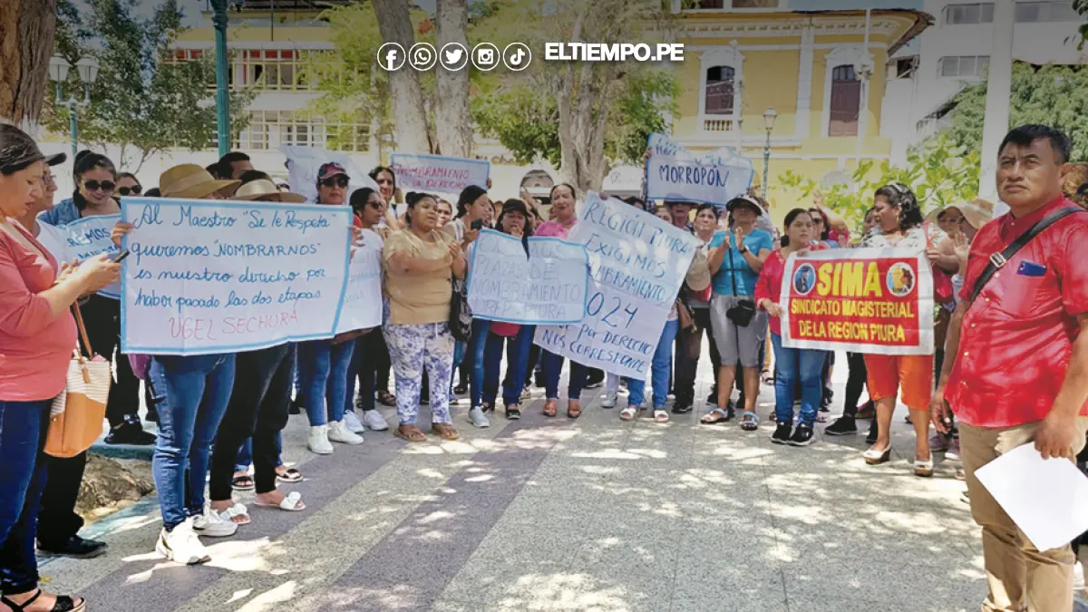 Un grupo de maestros se manifestó frente a la Catedral de Piura para exigir la regularización de plazas destinadas a contratos, luego de que 300 docentes quedaran sin opciones durante el proceso de adjudicación realizado por las UGEL.