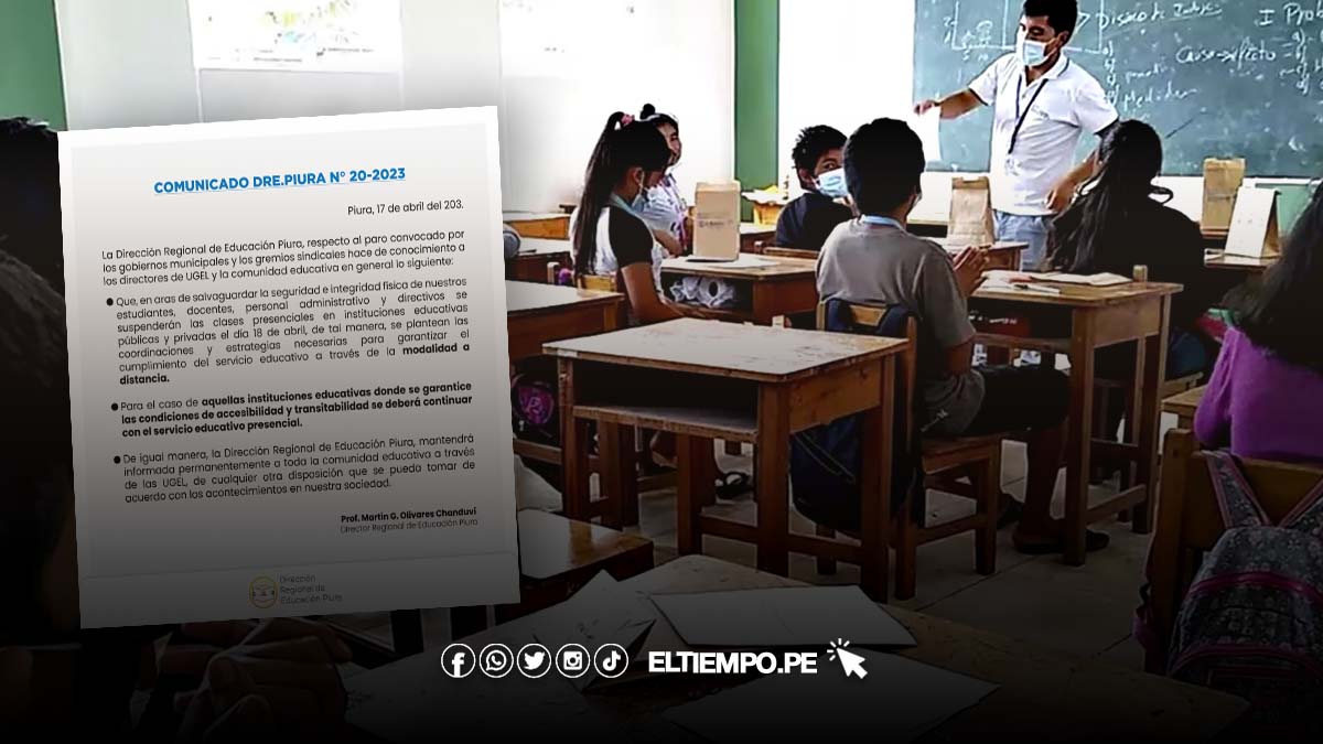 La Dirección Regional de Educación Piura informó a través de un comunicado, que ante el paro anunciado por gobierno municipales y gremios sindicales en la región, la clases de manera presencial quedan suspendidas este 18 de abril.