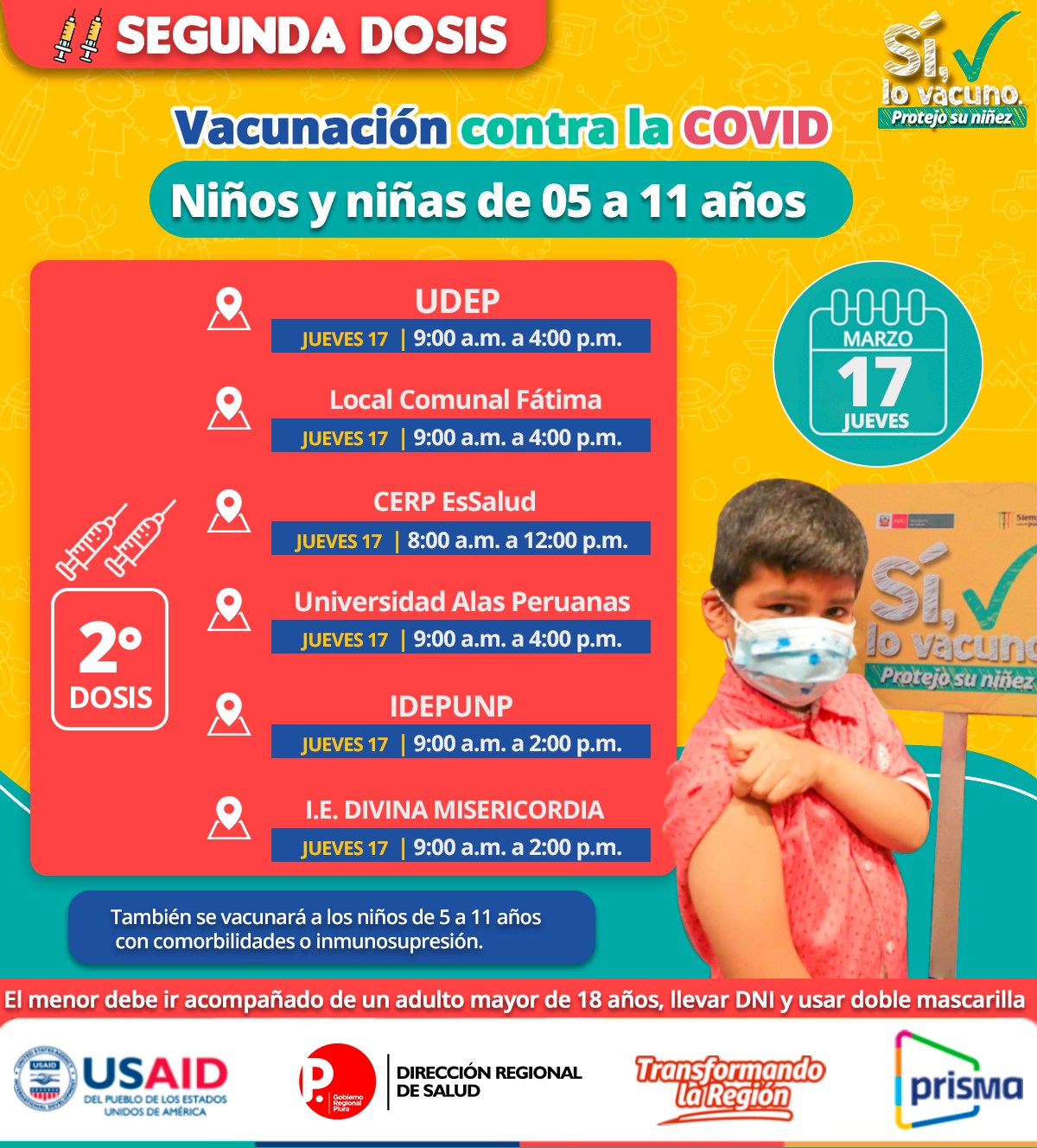 De igual modo, este domingo continúa la aplicación de la primera y segunda dosis contra la covid-19 para los niños y niñas de los siguiente colegios de 10 a 11 años y también para los demás menores 10 a 11 años con comorbilidades e inmunosupresión.