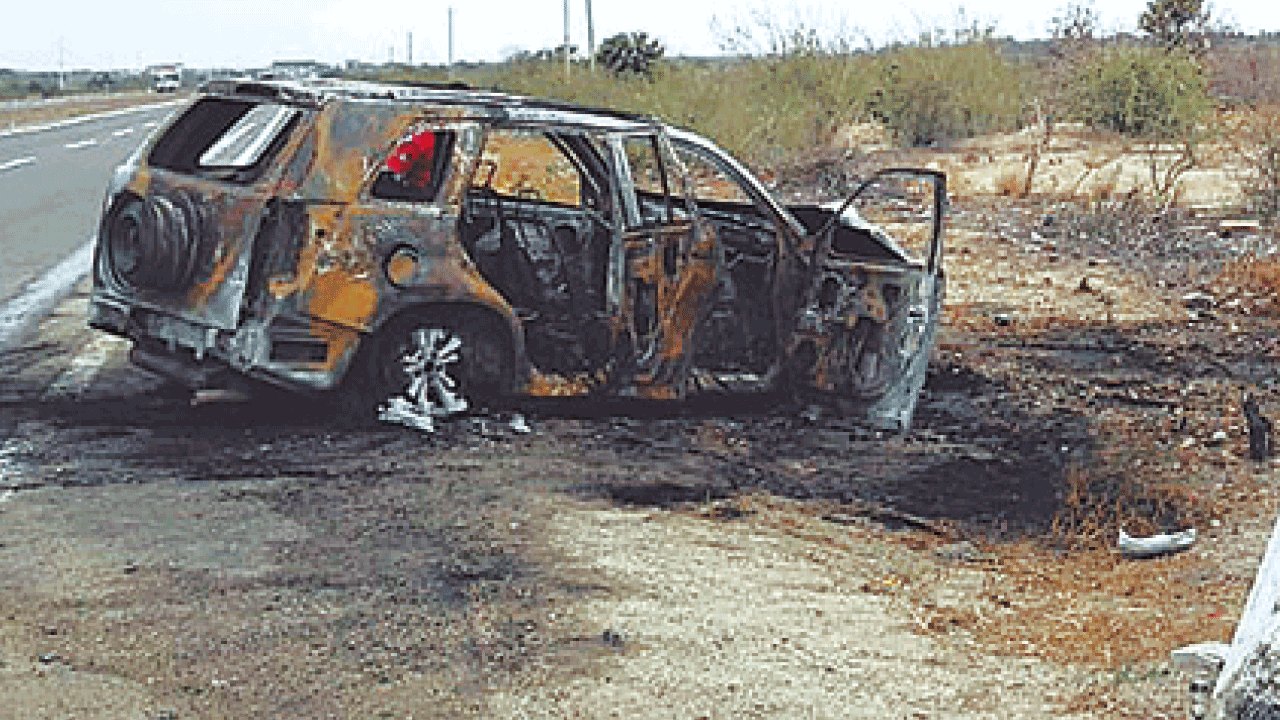 Un kilómetro antes del peaje de la carretera Panamericana un neumático del vehículo se rompió haciendo que el conductor pierda el control impactando la unida contra el muro e incendiándose.
