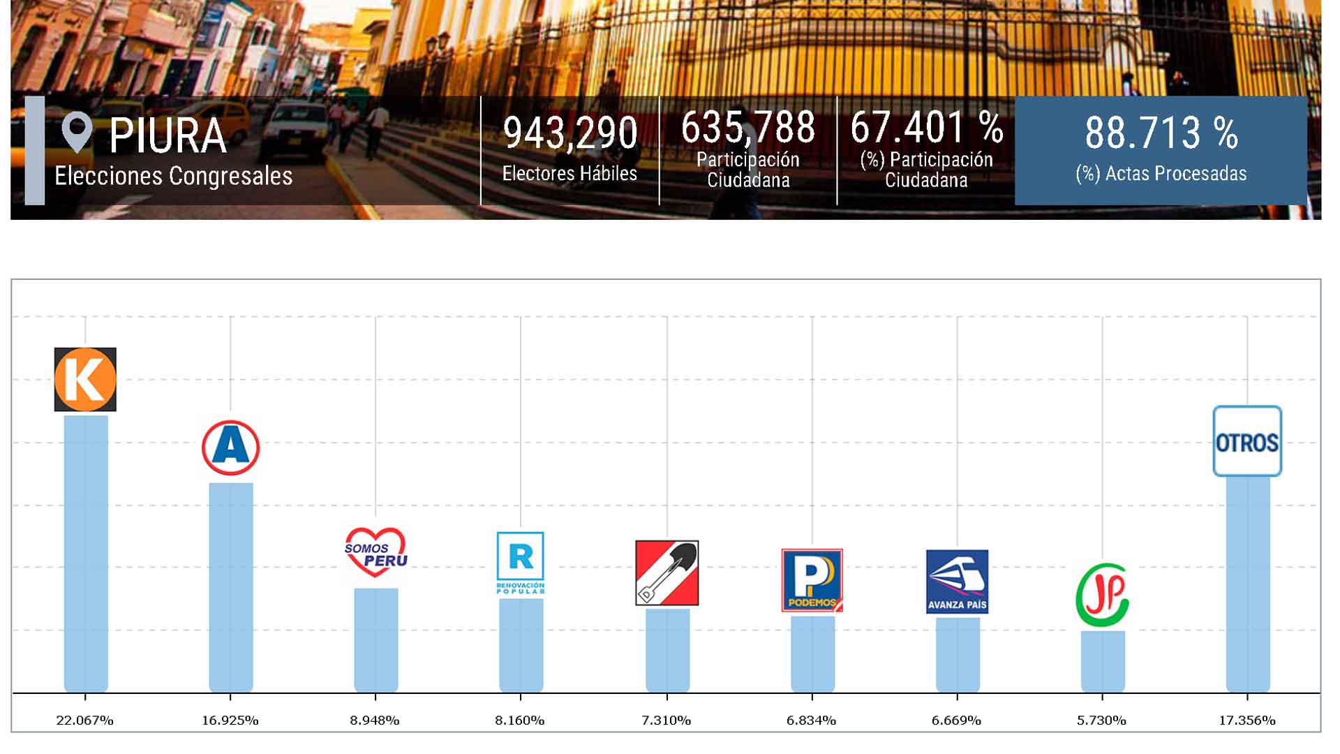 Según el conteo oficial de la Oficina Nacional de Procesos Electorales (ONPE) al 88.713% estos son los resultados en la región Piura.