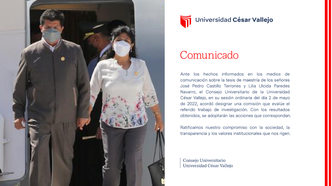 La Universidad Cesar Vallejo (UCV) iniciará investigación por presunto plagio en la tesis del presidente Pedro Castillo y su esposa Lilia Paredes.
