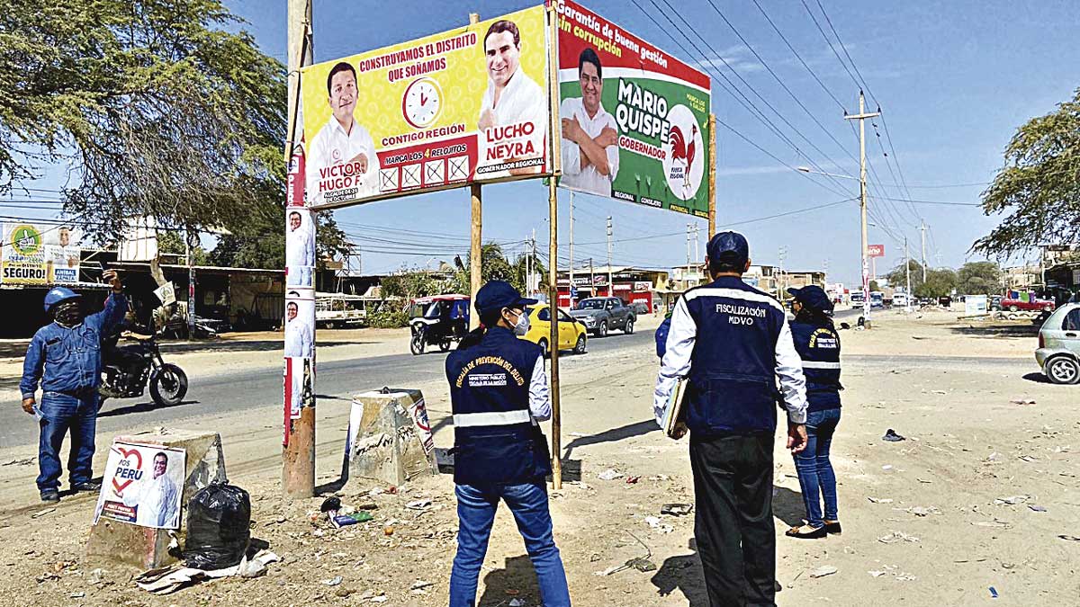 La segunda Fiscalía de Prevención del delito de Piura en coordinación con personal de la Defensoría del Pueblo, Enosa, el Jurado Electoral Especial y la Municipalidad de Veintiséis de Octubre retiraron de propaganda electoral prohibida.
