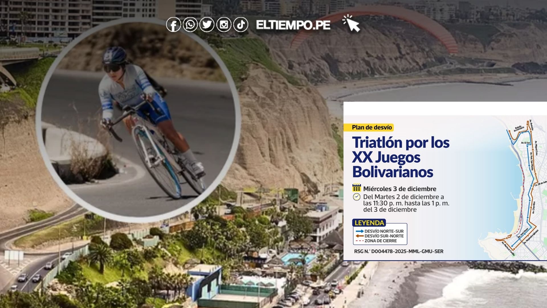 La prueba de ciclismo implicará un nuevo cierre total de la Costa Verde. Este regirá desde las 11:30 p.m. del jueves 4 de diciembre hasta la 1:00 p.m. del viernes 5.