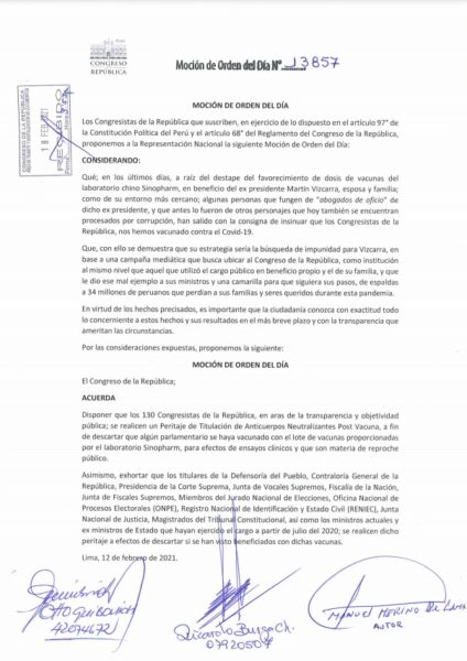 El Pleno del Congreso de la República aprobó con amplia mayoría la Moción 13857, la cual propone que los 130 congresistas se realicen un «Peritaje de Titulación de Anticuerpos Neutralizantes Post Vacuna», a fin de descartar que algún parlamentario se haya vacunado.