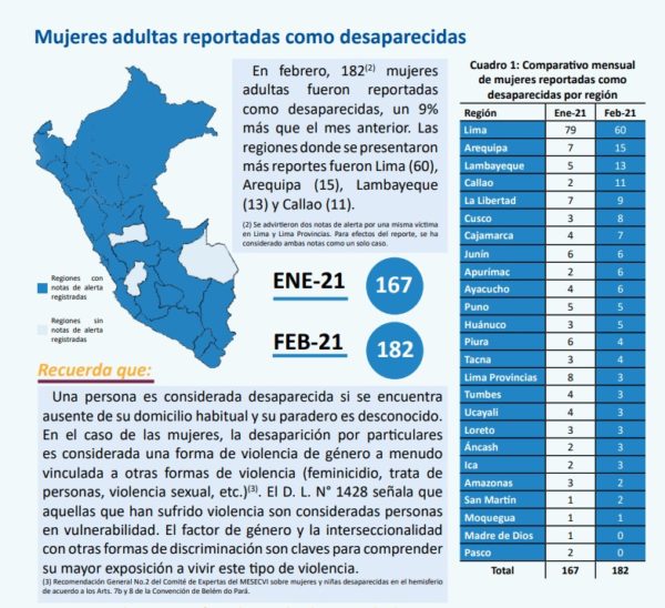 Asimismo, 182 mujeres adultas fueron reportadas como desaparecidas en febrero, lo cual representa un 9 % más que enero. Este aumento se ve reflejado principalmente en Lima (60), seguido de Arequipa (15), Lambayeque (13) y Callao (11).