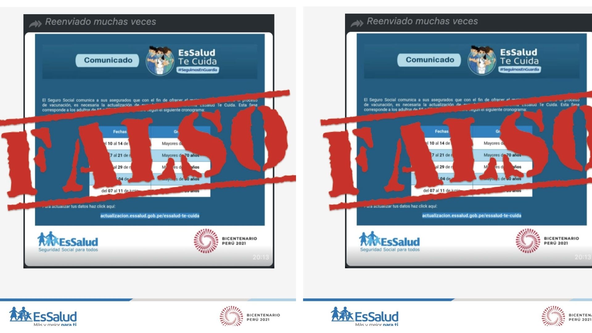 El Seguro Social de Salud (EsSalud) desmintió dicha información que tenía diseños de su institución, el mensaje difundía un supuesto cronograma de inmunización para personas mayores de 60 y 55 años.