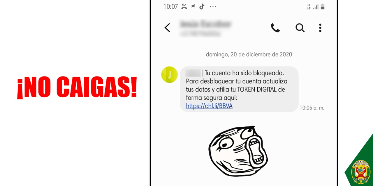 «¡Cuidado! No caigas en la trampa de personas inescrupulosas que envían SMS direccionando a páginas falsas para apoderarse de tus datos personales. Si eres víctima de phishing, comunícate con la División de Investigación de Delitos de Alta Tecnología: (01)4318898 / 942440729″, se lee en sus redes sociales.