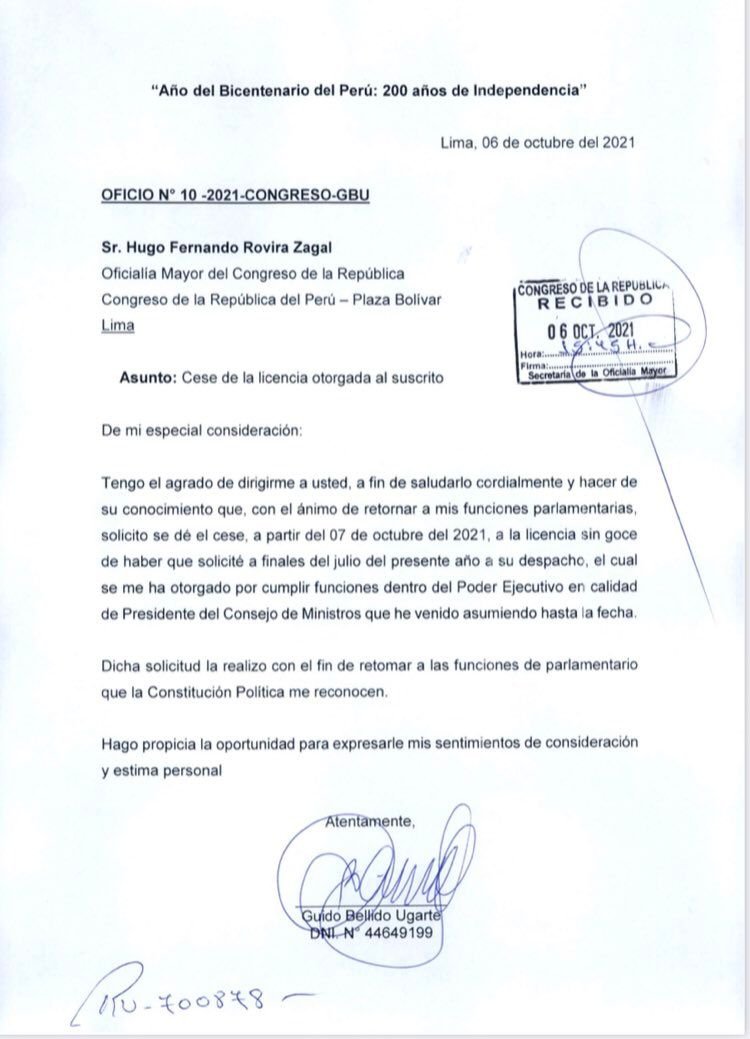«Con el animo de retomar mis funciones parlamentarias solicito se dé el cese, a partir del 07 de octubre del 2021, a la licencia sin goce de haber que solicité a finales de julio del presente año a su despacho, el cual se me ha otorgadfo por cumplir funciones dentro del Poder Ejecutivo en calidad de Presidente del Consejo de Ministros que he venido asumiendo hasta la fecha», se lee en el oficio.