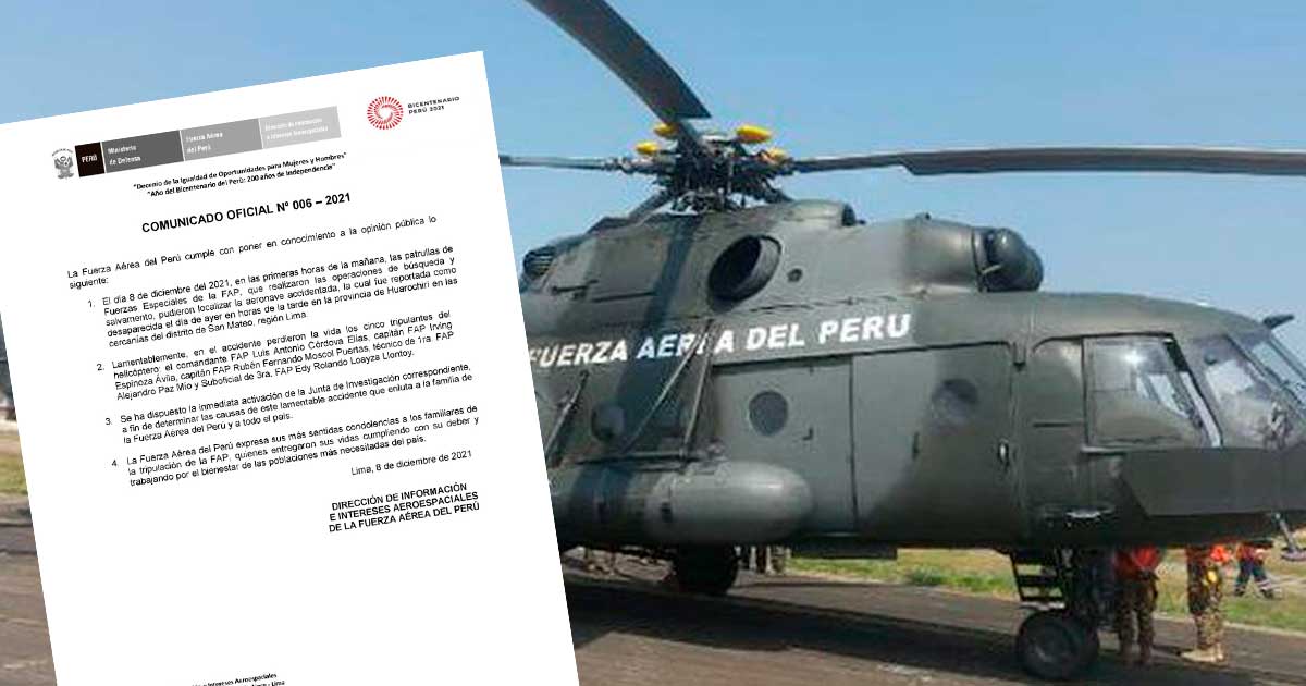 La Fuerza Aérea del Perú (FAP) informó que fallecieron los cinco tripulantes del helicóptero, que desapareció el martes 7 de diciembre tras partir desde el aeropuerto Jorge Chávez, en el Callao, con rumbo hacia la ciudad de San Ramón, Chanchamayo, en la región Junín.