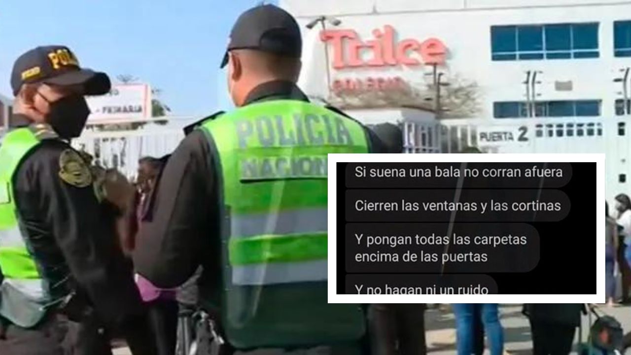 Según Canal N, en los mensajes se indicaba que el día de hoy (jueves 9) en esta sede de la cadena de colegios Trilce, iba a “correr bala” y mandaron las imágenes de las armas. Además se señaló que cerraran las ventanas porque al parecer una disputa terminaría en un tiroteo en Lima este 9 de junio del 2022.
