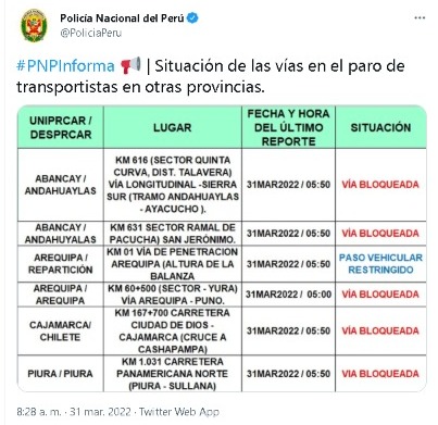 En ese sentido la Policía Nacional del Perú (PNP) informó sobre las carreteras que se encuentran bloqueadas y con acceso restringido. En esta ocasión el informe viene de las regiones Junín, Huaraz, Cajamarca, Arequipa, Apurímac y Piura, en donde se acata el paro de transportistas.