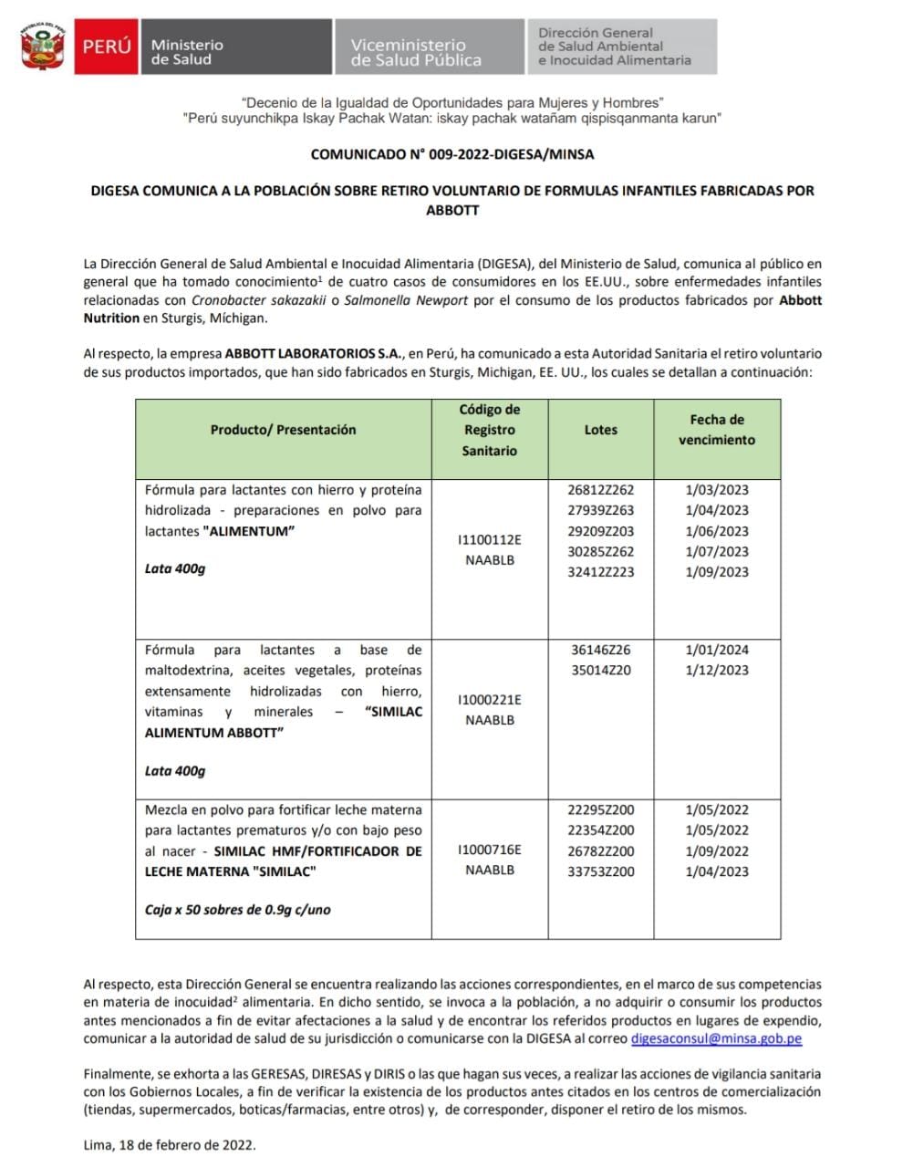 La Dirección general de Salud Ambiental e Inocuidad Alimentaria (Digesa) del Ministerio de Salud informó a través de un comunicado que las enfermedades infantiles están relacionadas con Cronobacter Sakasakii o Salmonela Newport luego de consumir las fórmulas.