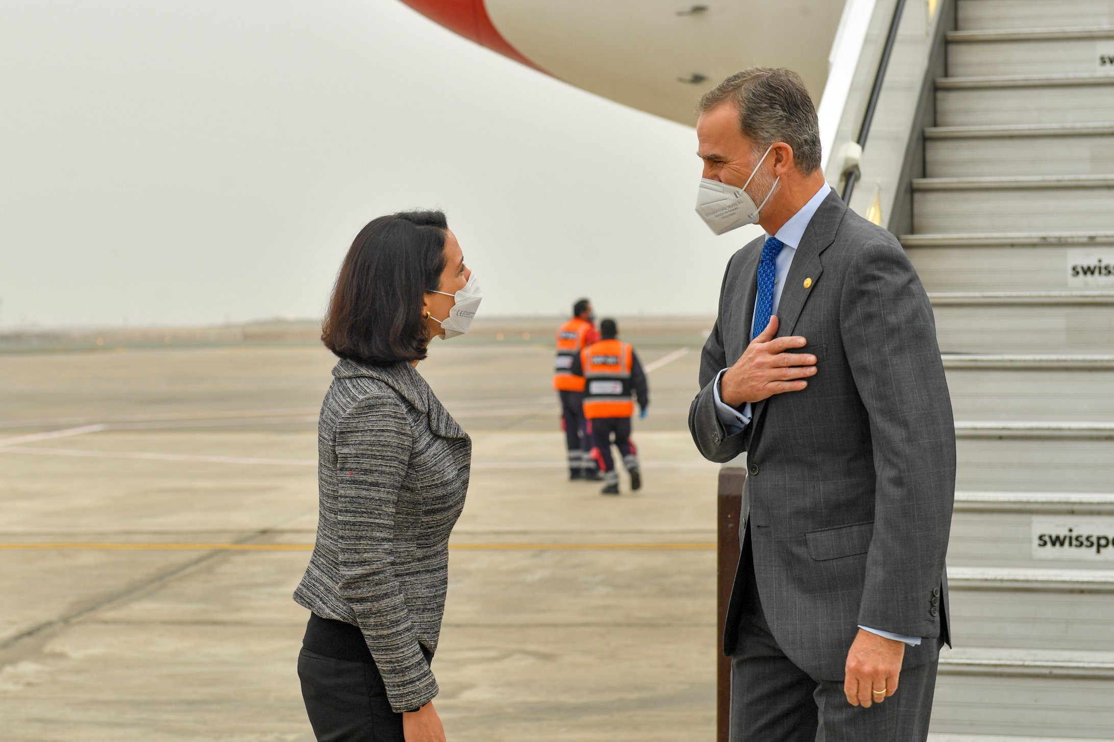 Felipe VI fue recibido por la ministra de Comercio Exterior y Turismo, Claudia Cornejo y miembros de la Fuerza Aérea del Perú (FAP).