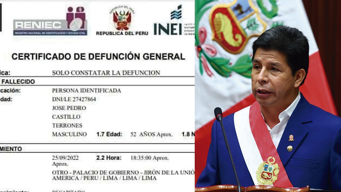 De acuerdo al certificado, el presidente Pedro Castillo «murió» en Palacio de Gobierno, en Lima, Perú, el 25 de setiembre del 2022 a las 6:35 p. m, a la edad de 52 años.