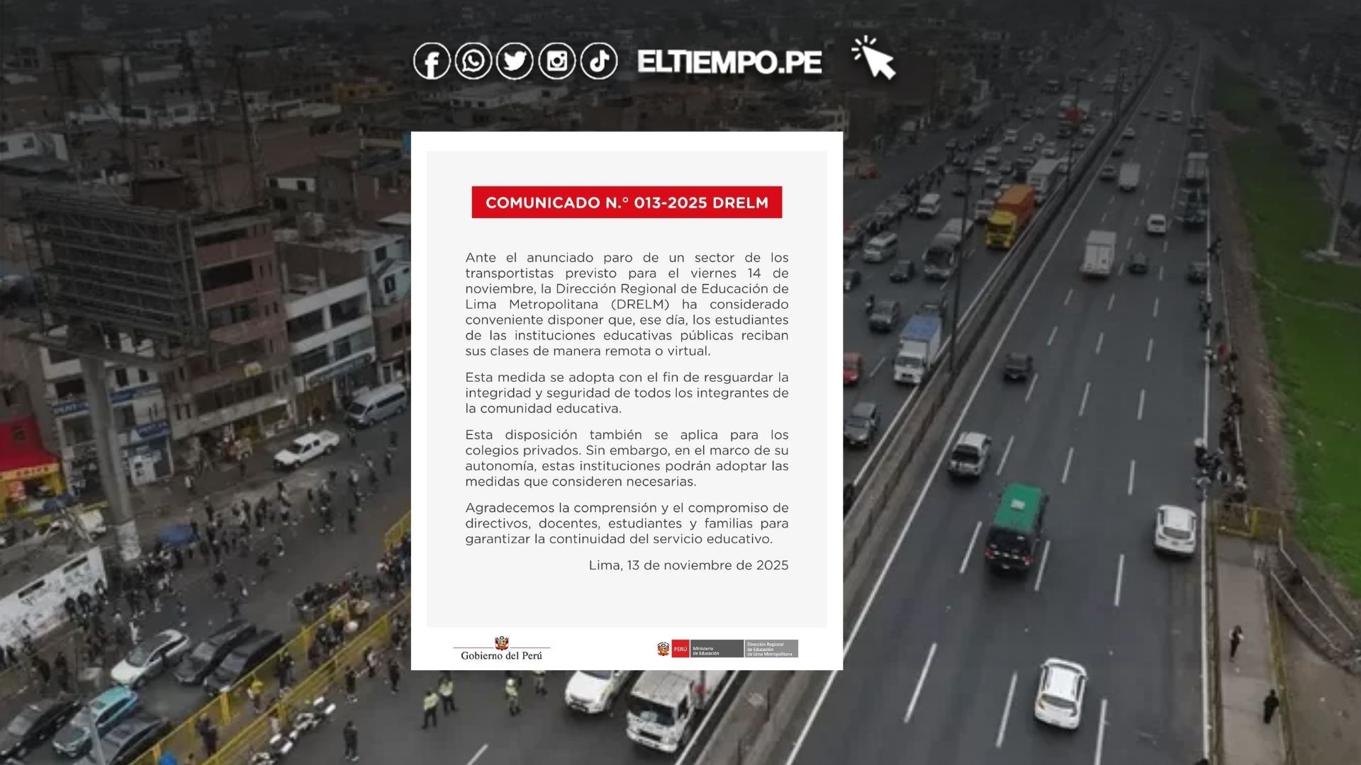 La Dirección Regional de Educación de Lima Metropolitana (DRELM) y la Dirección Regional de Educación del Callao (DREC) anunciaron este miércoles la suspensión de las clases presenciales en las instituciones educativas públicas y privadas que lo consideren necesario, ante la jornada de paro convocada por un sector del gremio transportista.