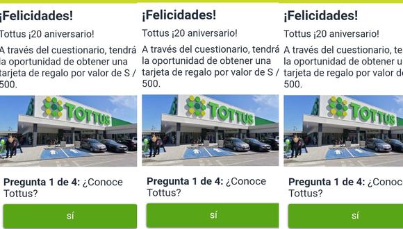 El referido link tiene el logotipo de Tottus y, al abrir el enlace, sale el mensaje: ¡Felicidades! Tottus ¡20 aniversario! A través del cuestionario, tendrá la oportunidad de obtener una tarjeta de regalo por valor de S/500?. Y aparecen cuatro preguntas, siendo la primera ¿Conoce Tottus?