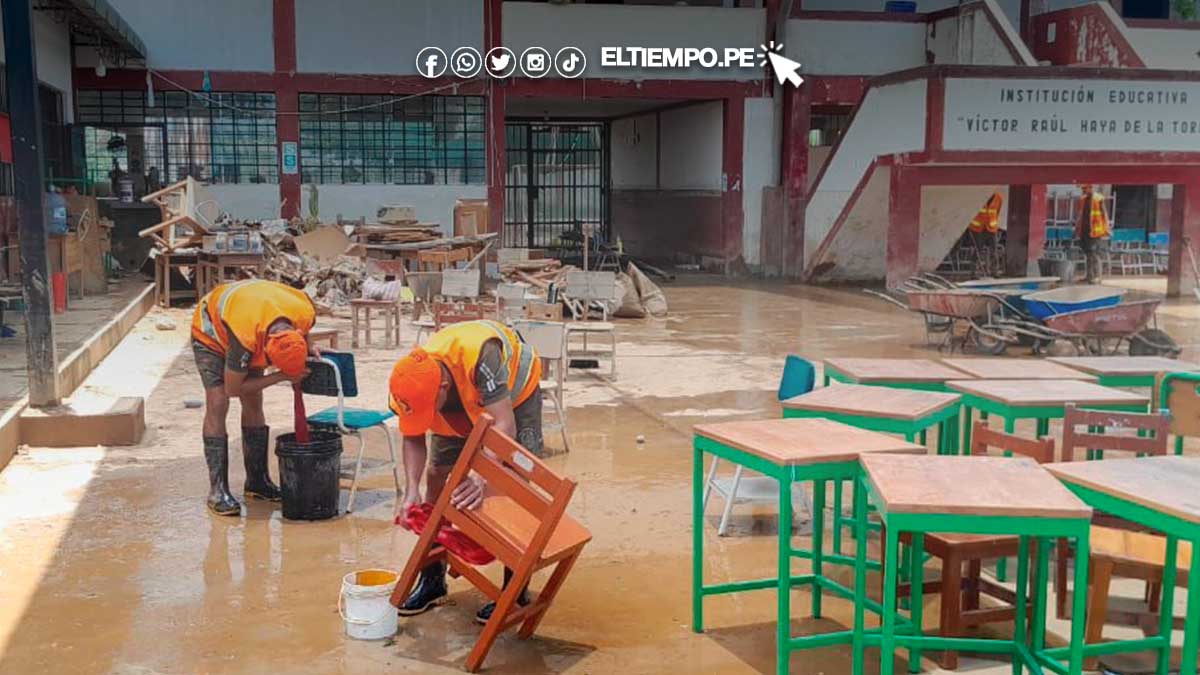 En Tumbes, 27 instituciones han sido afectadas, 9 de ellas con daños críticos. Uno de los colegios más perjudicados es la I.E. Víctor Raúl Haya de la Torre, en San Juan de la Virgen, donde 60 soldados del Ejército del Perú de la 9na Brigada de Infantería, realizan trabajos de limpieza y rehabilitación.